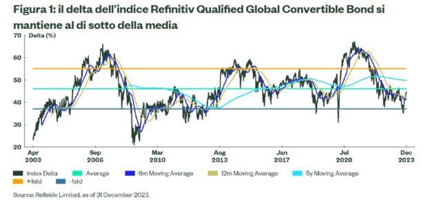 Infine, il profilo di convessità offerto dalle obbligazioni convertibili rimane una valida alternativa azionaria per gli investitori che potrebbero essere incerti sull’andamento del mercato nel 2024. La duration breve, esposizione al mercato azionario e al segmento crossover del credito possono rivelarsi interessanti in un contesto di propensione al rischio. Tuttavia, in caso di ”Hard Landing”, il profilo relativamente bilanciato e il livello basso del “Bond Floor” delle obbligazioni (circa il16% al 29 dicembre 2023) possono rappresentare una protezione per portafogli diversificati.