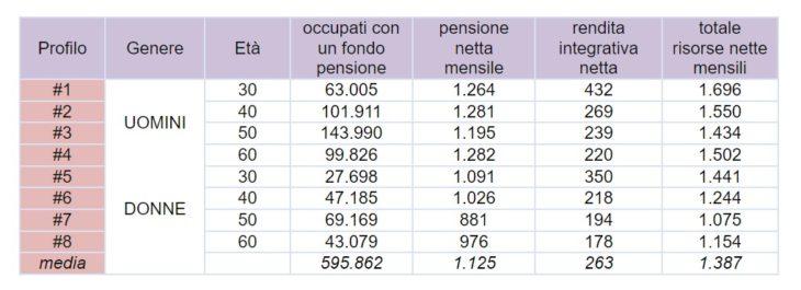● la stima dei valori delle pensioni medie nette oscilla tra gli 881€ delle donne cinquantenni e i 1.282€ degli uomini sessantenni, con una media complessiva per gli 8 profili di 1.125€ netti al mese;