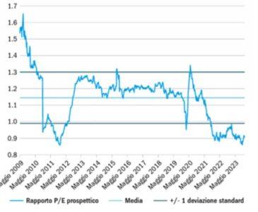 Fonte: Fonte: Bloomberg. Rapporti P/E prospettici (MSCI World Small Cap rispetto all’MSCI World). Da febbraio 2009 a dicembre 2023.