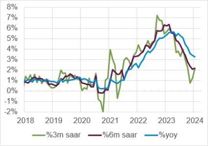 Fonte: Bloomberg/PIMCO, 8 febbraio 2024. Il grafico mostra il tasso d’inflazione annuale destagionalizzato misurato su base trimestrale, semestrale e annuale.
