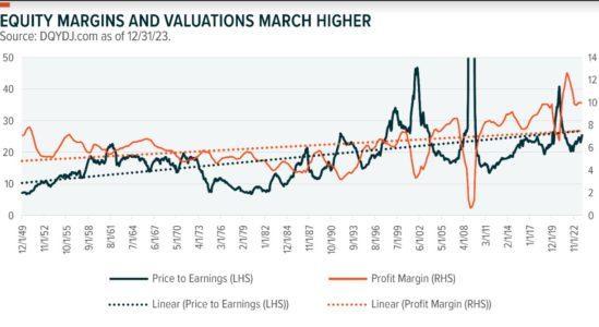 Certo, in ogni ciclo c’è un momento in cui le valutazioni azionarie sembrano arrivate a un tetto, ma se allarghiamo lo sguardo le cose cambiano. Le valutazioni riflettono infatti le aspettative di crescita e redditività future e, nel tempo, i margini di profitto delle aziende tendono ad aumentare. I margini di profitto dell’S&P 500 sono stati in media del 6,2% dal 1950 al 1955. Dal 2018 al 2023, i margini di profitto medi sono stati del 9,8%. Come mai? Questo avviene perché le aziende diventano più efficienti nel tempo grazie a un migliore utilizzo del capitale, del lavoro e della tecnologia.