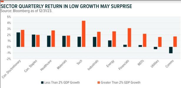 Storicamente, infatti, nei periodi in cui la crescita del PIL è stata inferiore al 2% i settori considerati “difensivi” come Utility e Servizi di comunicazione sono quelli che hanno registrato le peggiori performance medie. Ad offrire il rendimento medio più elevato sono stati i Consumi discrezionali, seguiti dai Beni di consumo e dalla Sanità. È interessante notare che anche i Materiali, il Tech e gli Industriali hanno ottenuto risultati relativamente buoni.