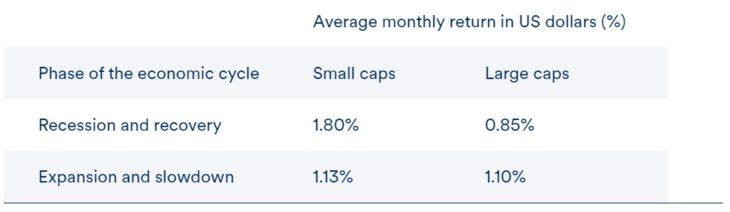 Mentre nelle fasi di espansione e di rallentamento i rendimenti medi dei titoli delle small cap e delle large cap sono stati simili, le small cap hanno mediamente conseguito rendimenti più che doppi rispetto alle large cap sia nelle fasi di recessione che in quelle di ripresa. Tuttavia, non esistono due cicli esattamente identici e il ciclo attuale potrebbe fornire indizi su ciò che ha in serbo per gli investitori.