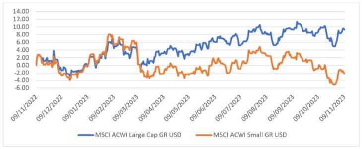Nel corso dell’ultimo anno, il destino delle imprese, di dimensioni grandi e piccole, a livello mondiale è stato divergente. Ciò è stato guidato principalmente dalle società più grandi, le cosiddette ‘Magnifiche 7’, ma riflette anche i rischi associati alle società più piccole, che sono più sensibili al ciclo economico.