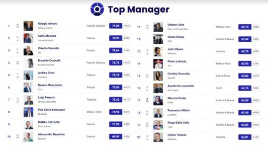 Quinto posto per Andrea Orcel (75.70), seguito da Renato Mazzoncini (75.50) e Luigi Ferraris (75.42). Stabili all’ottavo e al nono Pier Silvio Berlusconi (74.90) e Matteo Del Fante (71.90). Al decimo sale di uno Alessandro Benetton (69.94) che investe nel settore degli integratori alimentari. Su di due all’undicesimo Urbano Cairo (69,74), al centro di molti commenti per l’ipotesi della sua candidatura a sindaco di Milano. Stabile al dodicesimo Renzo Rosso (69.68), seguito da John Elkann (68.78) e Pietro Labriola (65.93). Su di uno al quindicesimo l’AD di Illy Cristina Scocchia (63.82), mentre Aurelio De Laurentiis (63.74) scende al sedicesimo. Con un balzo di sei conquista il diciassettesimo Miuccia Prada (63.52) che ha portato alla Fashion Week una collezione per riflettere sui cambiamenti di uomo e natura. Francesco Milleri (63.48), Diego Della Valle (63.03) e Carlos Tavares (62.01) chiudono la top 20. In Top 100 crescite rilevanti di: Roberto Sergio (53°,+14), Aldo Isi (62°,+8), Renato Ravanelli (71°,+7), Giampiero Strisciuglio (84°,+15).