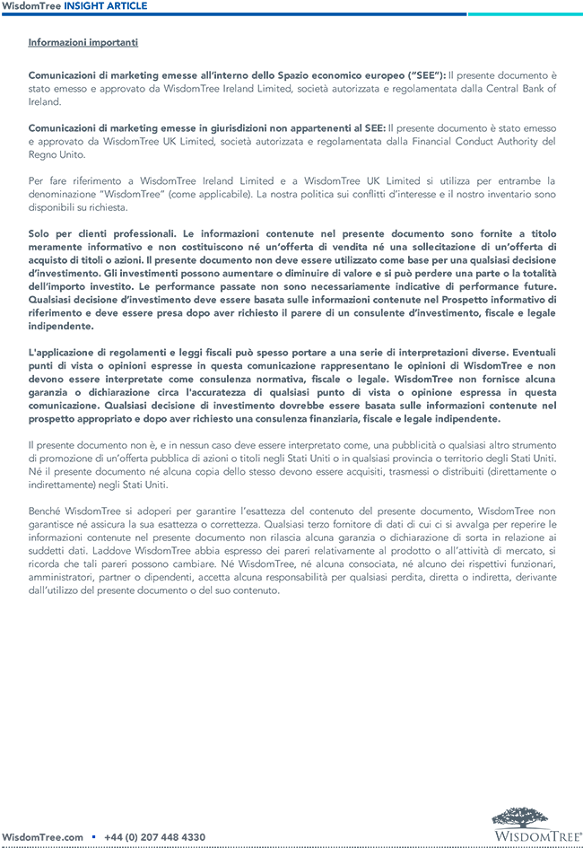 L’area ad accesso limitato è riservata ai clienti professionali. Le informazioni contenute nell’area ad accesso limitato non sono destinate a persone che si trovano negli Stati Uniti d’America e non devono essere da essi utilizzate. Accedendo all’area ad accesso limitato l’utente conferma di essere un cliente professionale ai sensi dell’Allegato II alla Direttiva 2014/65/UE del Parlamento europeo e del Consiglio del 15 maggio 2014 relativa ai mercati degli strumenti finanziari. Accedendo all’area ad accesso limitato l’utente conferma di essere d’accordo con la politica dei cookie. Se non si è d’accordo con queste condizioni non accedere al sito né alle eventuali pagine collegate. Questa area, al'interno del sito Web LMF Lamiafinanza, e il relativo contenuto sono stati forniti da WisdomTree UK Ltd autorizzata e disciplinata dalla FCA (Financial Conduct Authority) e da WisdomTree Ireland Ltd, autorizzata e disciplinata dalla Banca Centrale d’Irlanda (CBI) (insieme, “WisdomTree”). Il prezzo di qualsiasi azione o il valore di un investimento in Exchange-Traded Product (ETP) potrebbe fluttuare verso l'alto o verso il basso e un investitore potrebbe non recuperare la somma investita. Le precedenti performance non sono indicatori affidabili di quelle future. Questo materiale non deve essere inteso come una previsione, una ricerca o una consulenza in materia di investimento e non è un consiglio, né un'offerta o un invito ad acquistare o a vendere prodotti o strumenti finanziari o ad adottare qualsiasi strategia di investimento. Fare clic qui per leggere l'Esclusione di responsabilità completa.