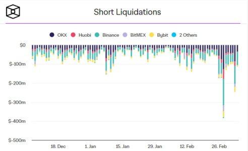In secondo luogo, la scorsa settimana il tasso di finanziamento annualizzato per i futures perpetui sul Bitcoin su Binance ha superato il 100% per la prima volta in oltre un anno, segnalando un notevole fervore in questo mercato. Ciò suggerisce che i prezzi dei contratti future fossero leggermente superiori a quelli del mercato spot sottostante. Inoltre, si è anche verificato un elevato volume di liquidazioni allo scoperto, il che significa che un gran numero di venditori “short” sono stati costretti a riacquistare l’asset per coprire le proprie posizioni. Questo improvviso aumento della domanda può accelerare ulteriormente la crescita dei prezzi, creando un ciclo positivo.