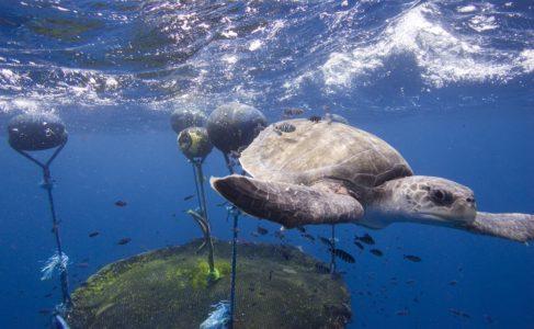 Una tartaruga marina che nuota attorno a un dispositivo di aggregazione dei pesci alla deriva, o dFAD, nell’Oceano Pacifico.