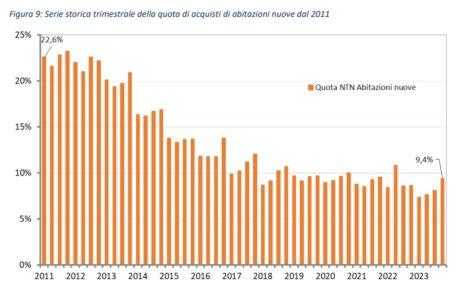 Gli acquisti delle persone fisiche hanno riguardato 191 mila unità, di cui quasi il 63% è “prima casa” e solo il 37% circa è stato acquistato avvalendosi di un mutuo ipotecario, registrando così, per la prima volta, una quota di compravendite con mutuo al di sotto del 40%. Gli acquisti di abitazioni di nuova costruzione rappresentano poco più del 9% del totale, quota ancora in crescita nel 4° trimestre 2023.