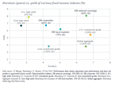 – Grafico. I mercati emergenti offrono la duration tipica dell’investment grade ma con il reddito dell’high yield
