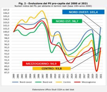 Sempre tra il 2000 e il 2021 anche le disparità tra il Nord e il Sud Italia sono aumentate. Analizzando il Pil pro-capite e fissando il dato al 2000