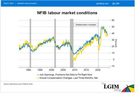 L’aumento dell’immigrazione aiuta anche a spiegare perché il mercato del lavoro statunitense sembra essersi riequilibrato nonostante i dati sull’occupazione siano ancora forti. Come mostrato nel grafico, normalmente è necessaria una recessione per ridurre la pressione salariale e alleviare le difficoltà di reclutamento.