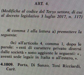 L’on. Fabio Porta, parlamentare del Partito Democratico eletto all’estero, ha recentemente dichiarato “Nel corso dell’esame del decreto sul Terzo Settore, ho presentato, assieme ai colleghi Di Sanzo, Toni Ricciardi e Carè, un emendamento teso a chiarire la partecipazione delle associazioni italiane all’estero alle prerogative e i diritti garantiti al Terzo settore che purtroppo questa maggioranza ha bocciato. Un gesto che non giova ad aiutare la necessità di fare sistema chiesto sempre a gran voce, ma poi in pratica poco concretizzato come in questo caso”.