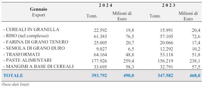Le esportazioni dall’Italia dei prodotti del settore cerealicolo nel primo mese del 2024 sono aumentate di 46.200 tonnellate nelle quantità (+13,3%) e di 22,0 milioni di Euro nei valori(+4,7%), rispetto allo stesso periodo 2023.