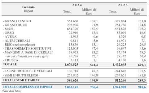 Per quanto riguarda i cereali in granella, nel singolo mese di gennaio 2024 sono risultate in aumento le quantità importate in Italia di grano tenero (+171.800 t), granturco (+92.500 t) e orzo (+18.000 t); in diminuzione invece risultano gli arrivi di grano duro (-51.400 t) ed altri cereali minori (-5.100 t). Il corrispondente valore dei cereali importati passa da 477,1 a 396,5 milioni di euro (-17%).