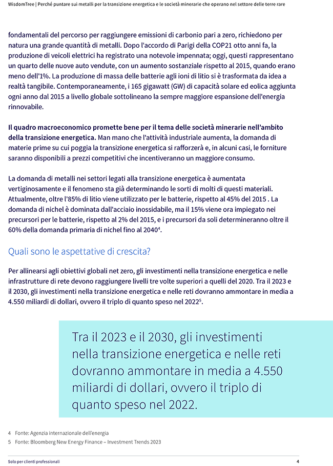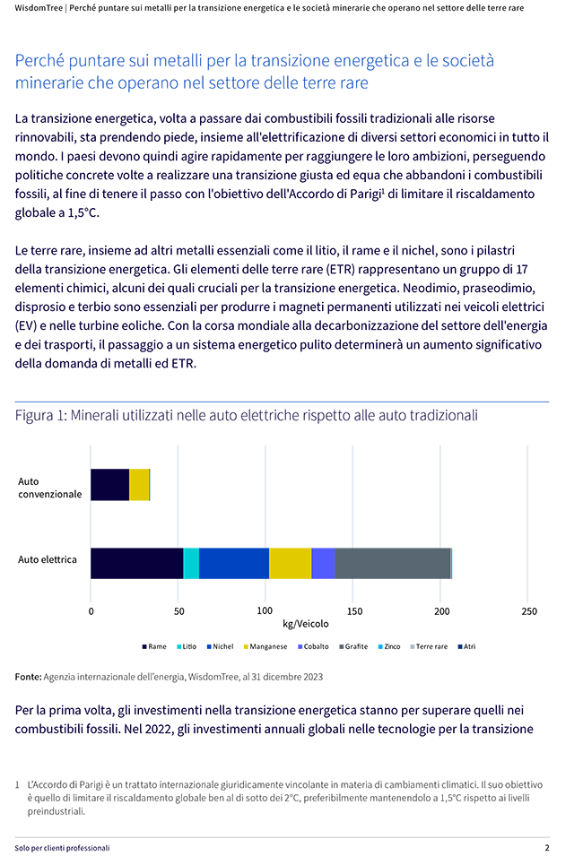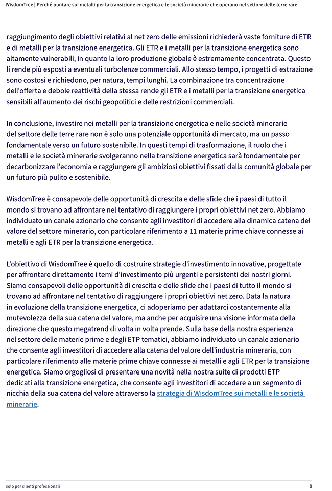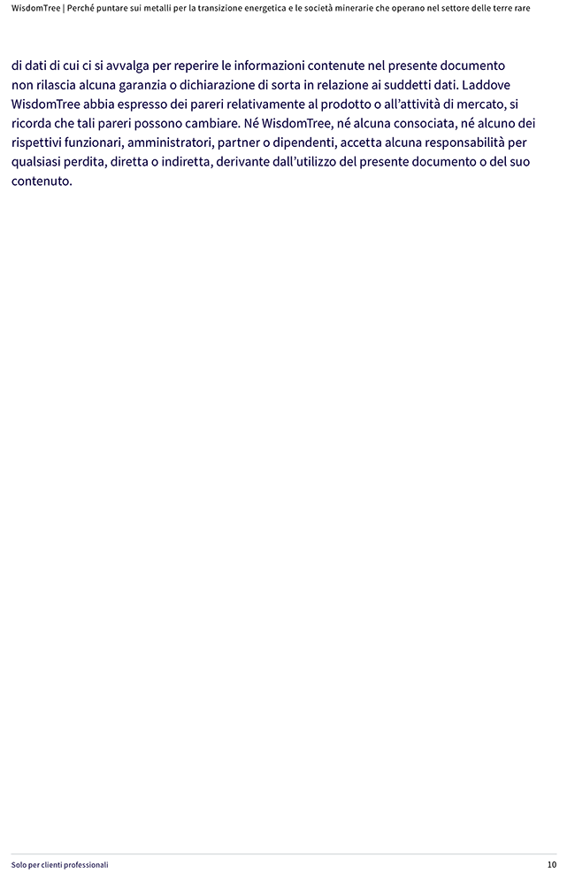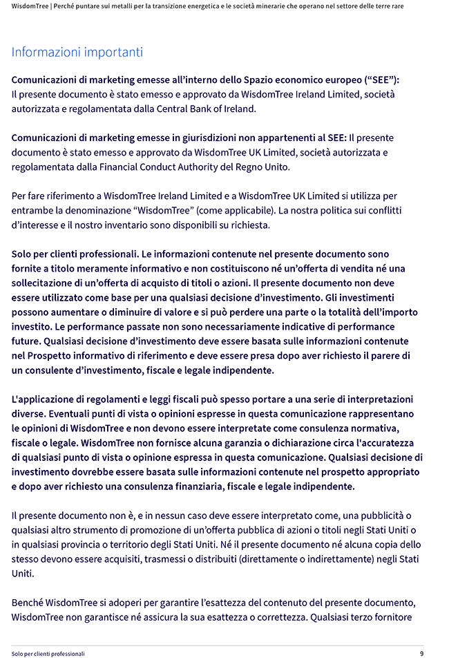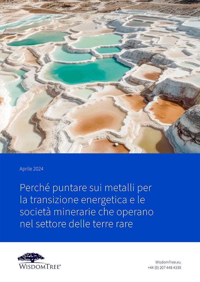 L’area ad accesso limitato è riservata ai clienti professionali. Le informazioni contenute nell’area ad accesso limitato non sono destinate a persone che si trovano negli Stati Uniti d’America e non devono essere da essi utilizzate. Accedendo all’area ad accesso limitato l’utente conferma di essere un cliente professionale ai sensi dell’Allegato II alla Direttiva 2014/65/UE del Parlamento europeo e del Consiglio del 15 maggio 2014 relativa ai mercati degli strumenti finanziari. Accedendo all’area ad accesso limitato l’utente conferma di essere d’accordo con la politica dei cookie. Se non si è d’accordo con queste condizioni non accedere al sito né alle eventuali pagine collegate. Questa area, al'interno del sito Web LMF Lamiafinanza, e il relativo contenuto sono stati forniti da WisdomTree UK Ltd autorizzata e disciplinata dalla FCA (Financial Conduct Authority) e da WisdomTree Ireland Ltd, autorizzata e disciplinata dalla Banca Centrale d’Irlanda (CBI) (insieme, “WisdomTree”). Il prezzo di qualsiasi azione o il valore di un investimento in Exchange-Traded Product (ETP) potrebbe fluttuare verso l'alto o verso il basso e un investitore potrebbe non recuperare la somma investita. Le precedenti performance non sono indicatori affidabili di quelle future. Questo materiale non deve essere inteso come una previsione, una ricerca o una consulenza in materia di investimento e non è un consiglio, né un'offerta o un invito ad acquistare o a vendere prodotti o strumenti finanziari o ad adottare qualsiasi strategia di investimento. Fare clic qui per leggere l'Esclusione di responsabilità completa.