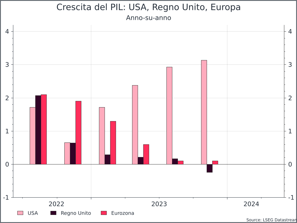 Un dato degno di nota nel primo trimestre del 2024 è quello relativo alla solidità dell’economia Usa, cresciuta in modo costante rispetto ad Europa e Regno Unito, dove la “crescita zero” rappresenta comunque un risultato migliore dei pronostici di dodici o diciotto mesi fa.