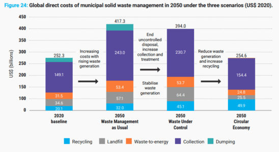 Secondo il rapporto, un approccio basato sull’economia circolare alla gestione dei rifiuti solidi urbani comporterebbe anche notevoli risparmi sui costi. Continuare con le attuali pratiche di gestione dei rifiuti costerebbe più di 417 miliardi di dollari all’anno entro il 2050, un aumento di 165 miliardi di dollari rispetto ai costi del 2020. Nello scenario dell’economia circolare, che prevede la riduzione dei rifiuti e l’aumento del riciclo, i costi stimati sarebbero inferiori a 255 miliardi di dollari all’anno. Questo approccio circolare eviterebbe “costi galoppanti di gestione dei rifiuti” e fornirebbe anche “prestazioni ambientali decisamente migliori”, affermano gli autori del rapporto.