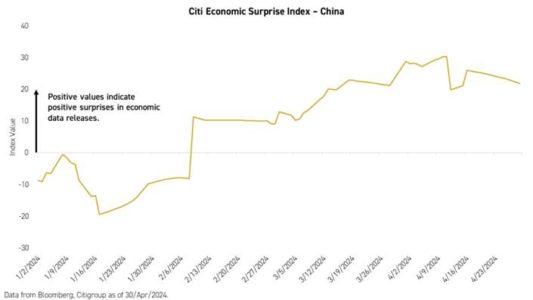 - L’economia è in miglioramento e i consumi si stanno riprendendo. La crescita del PIL cinese nel 1° trimestre è stata del 5.3%, superiore alle attese del 4.8% e il Citi Economic Surprise Index (che misura la sorpresa verso l’alto o il basso di un paese) mostra un chiaro miglioramento dall’inizio dell’anno.