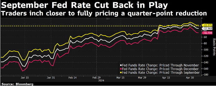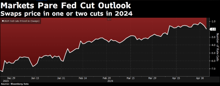 Questi dati vengono da noi letti come il naturale effetto di ritardo temporale delle azioni di politica monetaria e non ci sorprenderemmo se dalla narrativa dall’economia resiliente si dovesse presto tramutare a quella del rallentamento economico, con conseguente taglio dei tassi prima di novembre. In seguito all’uscita dei dati di venerdì scorso, le aspettative implicite sul taglio dei tassi per il 2024 sono aumentate da 1 a 2.