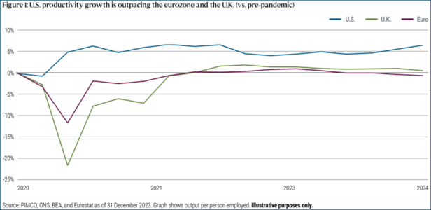 Nonostante alcuni segnali di miglioramento negli ultimi mesi, l’Europa continua a sottoperformare la crescita degli Stati Uniti su base ciclica, soprattutto a causa di una politica fiscale più restrittiva e della più rapida trasmissione di una politica monetaria più rigida. Tuttavia, questa sottoperformance potrebbe consolidarsi su base secolare, poiché l’Europa si trova ad affrontare una serie di venti contrari di più lungo periodo. La Germania sembra particolarmente esposta, ma il resto dell’Europa non è immune, compreso il Regno Unito.