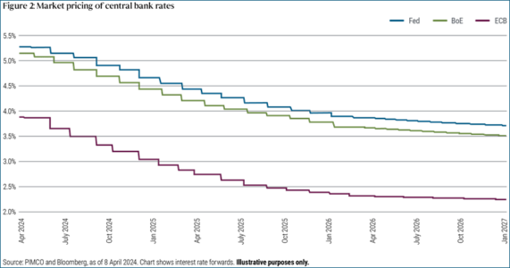 Certo, questi problemi sono particolarmente acuti in Germania, ma anche il resto dell’Europa ne risente, compreso il Regno Unito. Nel Regno Unito, in particolare, riteniamo che vi sia un’opportunità di mercato, dato che il percorso dei tassi della Banca d’Inghilterra è prezzato al di sopra di quello della Federal Reserve (Figura 2), nonostante le aspettative di crescita ciclica e secolare siano inferiori e si prospetti una politica fiscale più restrittiva.