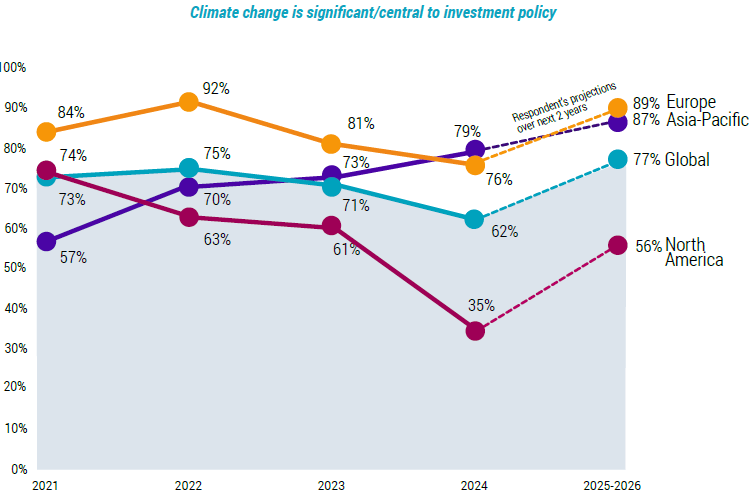 La quarta indagine annuale di Robeco su 300 investitori rivela ampie differenze regionali nell’atteggiamento verso gli investimenti climatici. La regione Asia-Pacifico (APAC) marcia spedita, mentre in Nord America si registra un tiepido interesse. La quota di investitori della regione APAC per i quali il cambiamento climatico costituisce un aspetto centrale o significativo della politica di investimento è risultata pari al 79%, superando per la prima volta quella europea (76%). L’entusiasmo, tuttavia, continua a diminuire in Nord America nel quadro delle controversie politiche sul costo percepito dell’integrazione dei fattori ambientali, sociali e di governance (ESG) negli investimenti; qua infatti solo il 35% degli intervistati ritiene prioritari gli investimenti climatici. Di conseguenza, la media globale è scesa al 62% rispetto al 71% del 2023, ma segnala comunque che la maggioranza degli investitori considera gli investimenti nel clima una priorità.