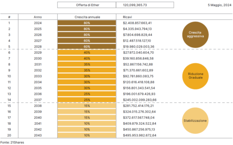 Completata quest’ultima operazione, si ottiene che il valore di Ethereum tra 20 anni potrebbe raggiungere un valore massimo di 837,6 miliardi di dollari. Considerando che l’offerta di Ether di riferimento è di 120.099.365,73 unità, il prezzo unitario massimo sarà di 6.974,08 dollari. In altre parole, Ethereum potrebbe registrare una crescita del 122% dai valori attuali, secondo il “best case scenario”. Noi di 21Shares suggeriamo comunque agli investitori di interpretare i risultati di questa valutazione DCF con cautela e di fare le proprie valutazioni riguardo ai flussi di cassa proiettati e ai tassi di sconto.