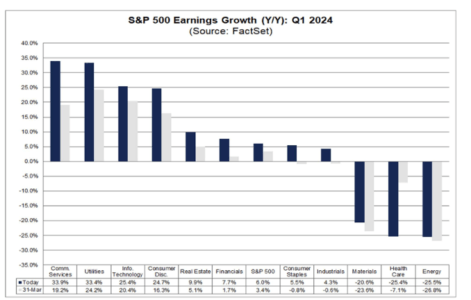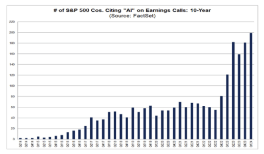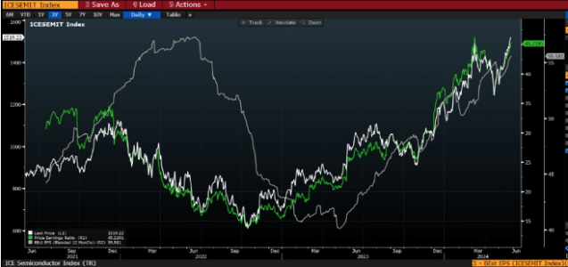 Ottimismo giustificato soprattutto dalla stagione degli utili che ha evidenziato crescite superiori alle attese. Questo ottimismo ha colpito in particolare alcuni settori, fra tutti il settore tecnologico, guidato dalle aspettative sul futuro dell’intelligenza artificiale (IA). IA che è stata citata molto durante la stagione degli utili, con circa 200 aziende che l’hanno menzionata nel primo trimestre 2024, e in particolare nel settore tech dove circa il 90% delle aziende ha parlato dell’intelligenza artificiale. Il settore che maggiormente ha beneficiato dell’IA è stato quello dei semiconduttori, dato che l’IA per funzionare ha bisogno di semiconduttori sempre più potenti e veloci. Questo ha alimentato eccessivamente l’ottimismo del mercato portando le valutazioni dei semiconduttori da 15x PE a fine 2022 a 41x PE oggi (grafico di destra).