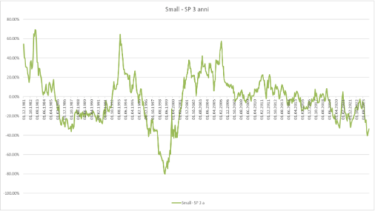In secondo luogo, se estendiamo l’analisi non solo all’equipesato ma anche alle aziende piccole vediamo come le small cap negli Stati Uniti abbiano sofferto di una forte sotto-performance a tre anni. Come vediamo dal grafico il gap di performance fra Small e S&P500 a tre anni ha raggiunto il -40%, valori peggiori si sono registrati solo nel 1998.