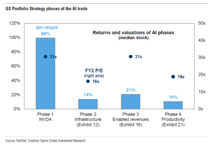 Questo scenario è confermato anche da una ricerca di una delle principali Banche d’Affari americane (Goldman Sachs), secondo cui lo sviluppo dell’AI si espanderà gradualmente a diversi settori del mercato e vedrà quindi diverse fasi di sviluppo. La prima fase come sappiamo è stata monopolizzata dalla società Nvidia, ma sta ora iniziando la seconda fase che sarà dominata dalle infrastrutture, tra le quali annoveriamo data center, cloud provider, cyber securities, ma anche infrastrutture di reti elettriche e quindi Utilities, tanto è vero che nel portafoglio consigliato per prendere esposizione a questi temi, circa ¼ dei titoli appartengono proprio al settore delle utilities.