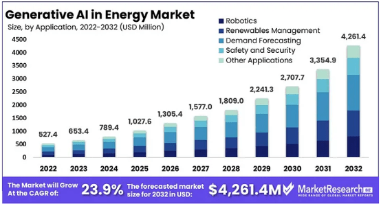 Alle stesse conclusioni arriva anche S&P Global Commodity Insights, secondo cui la tecnologia legata alle intelligenze artificiali porterà a un significativo aumento netto del consumo energetico degli Stati Uniti. Secondo alcune ricerche si prevede che la domanda di energia AI aumenterà da circa 527,4 milioni di dollari nel 2022 a ben 4.261,4 milioni di dollari entro il 2032, con un robusto tasso di crescita annuale composto (CAGR) del 23,9% dal 2023 al 2032.