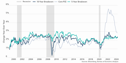 Per quanto riguarda il primo “ingrediente” della ricetta, è possibile risalire alle attese del mercato per l’inflazione a 10 anni attraverso il tasso di inflazione di pareggio a 10 anni, a sua volta dato dal differenziale di rendimento tra i Treasury Inflation-Protected Securities (TIPS) e i Treasury nominali. Ad oggi le aspettative di inflazione rimangono solide (vedi grafico sotto), dal momento che gli investitori confidano nel ritorno dell’inflazione vicino al target del 2%. Tuttavia, a nostro avviso, occorre ampliare la prospettiva e considerare che prima del terzo millennio, i tassi d’inflazione a lungo termine si aggiravano intorno al 6% negli Stati Uniti e al 10% nel Regno Unito, perciò gli ultimi tre decenni potrebbero rappresentare delle “anomalie” sul fronte macroeconomico a livello globale.