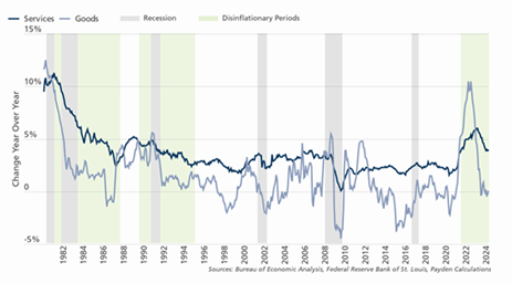 Esiste pertanto l’ipotesi che, nell’era post-Covid, l’inflazione si assesti su livelli più elevati rispetto agli ultimi vent’anni. Del resto, una volta raggiunto l’apice, i prezzi hanno storicamente impiegato diverso tempo (dai cinque ai sette anni) a rallentare e l’ultimo miglio del percorso di disinflazione si è spesso rivelato il più tortuoso, a causa del lento recedere dei prezzi dei servizi (vedi figura sotto). Ad oggi, con la normalizzazione delle catene di approvvigionamento, abbiamo assistito al rapido calo dei prezzi dei beni, mentre quelli dei servizi sembrano meno reattivi. Ad ogni modo, la potente combinazione di politiche fiscali e monetarie dell’era Covid se, da un lato, ha portato all’esplosione dell’inflazione, dall’altro ha testato la solidità del mercato del lavoro che oggi sembra in buona salute. Questo potrebbe indurre i policymaker più orientati all’occupazione a preferire la situazione attuale alla crescita stagnante degli anni ’10 del 2000 e quindi a optare per un target di inflazione più elevato rispetto al recente passato. Come investitori, ci sembra quindi prudente considerare un livello di inflazione di pareggio leggermente più alto, intorno al 2,5%, rispetto all’1,6% degli anni 2010.