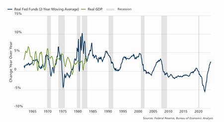 Passando al secondo “ingrediente”, per risalire al “fair value” del Treasury a 10 anni occorre considerare anche la curva attesa dei tassi d’interesse a breve termine, corretti per l’inflazione. L’andamento del tasso sui Fed Funds può essere un ottimo punto di partenza, anche se nel breve termine il percorso dei tassi può variare notevolmente come conseguenza sia delle decisioni di politica monetaria, sia delle attese del mercato sull’evoluzione dei tassi (cd. Forward Guidance). Per questo, per stimare la traiettoria dei tassi a breve termine, la strada migliore, invece che analizzare le previsioni implicite del mercato per l’andamento del tasso nominale sui Fed Funds, è considerare l’andamento di fattori non monetari come il rendimento atteso sugli investimenti, che varia in relazione alla crescita reale prevista e che rappresenta uno dei principali driver dei tassi d’interesse reali (vedi grafico sotto). Ad esempio, i tassi a breve termine più bassi o addirittura negativi a cui abbiamo assistito negli anni 2010 riflettevano una crescita economica stagnante e un sentiment pessimista sulla congiuntura economica e sul rendimento degli investimenti.