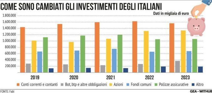 La FABI calcola che la ricchezza finanziaria sia cresciuta di 80 miliardi nel 2023; risparmio 5.216 miliardi, +552 miliardi dal 2019 grazie al boom di btp, obbligazioni e fondi comuni: +144 miliardi.