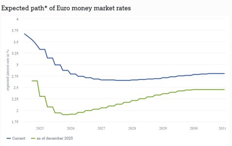 Anche il mercato sembra essere di questo avviso, come mostra il nostro “Grafico della settimana”*. Mentre all’inizio dell’anno i contratti futures prevedevano non meno di sette tagli dei tassi della BCE di 25 punti base ciascuno per il 2024, le aspettative del mercato si sono ora adeguate a un più realistico taglio di tre tassi, corrispondente a un tasso di deposito di fine anno del 3,25%. Per il 2025, il mercato aveva inizialmente previsto un tasso di policy inferiore al 2%, mentre attualmente i contratti futures implicano che i tassi di interesse raggiungeranno il minimo solo nella seconda metà del decennio, a un tasso di circa il 2,5%.