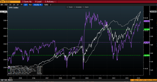 Se pesiamo meno questi grossi titoli e prendiamo dunque l’indice equi-pesato troviamo un PE a 16x a sconto del 5% rispetto alla sua media storica.