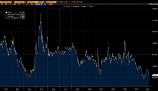 Passiamo alla Cina dove il rapporto prezzo su Utili è a 11x del 10% sotto la sua media. Se inoltre facciamo il rapporto fra PE cinese e quello Americao, notiamo che il PE cinese vale la metà dell’americano sui minimi degli ultimi 20 anni. Aveva toccato questo livello solo nel 2014-2020 e a inizio 2024.