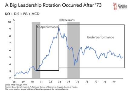 Così i titoli Nifty Fifty che erano stati venduti ad 80-90 volte gli utili nel 1968, all’apice di un potente bull market, stramazzarono al suolo non appena si raffreddarono gli entusiasmi. E molti li rividero ad 8-9 volte gli utili nel 1973 con una perdita del 80%. Molte di queste aziende sono fallite o hanno avuto gravi problemi.
