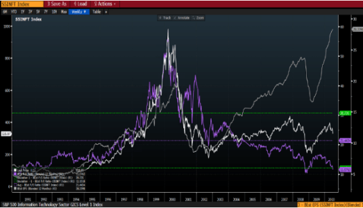 Ma la stragrande maggioranza dei titoli internet del 1999 e 2000 riguardava aziende che oggi non esistono più. Se prendiamo per esempio il rapporto Prezzo su Utili di fine ‘99 aveva raggiunto circa 60x PE (linea viola), prima di crollare sotto 20 a fine 2002. Quindi segno inequivocabile di un mercato che si è spinto troppo oltre.