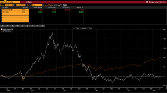 Per scoprirlo spostiamoci alla fine del 2021. Siamo nel 2021 e l’investitore era affascinato dalla rivoluzione tecnologica e dalla blockchain. Se prendiamo uno dei prodotti che maggiormente aveva riscosso successo cioè Ark Innovation, un ETF che investe nella frontiera digitale e blockchain, il prodotto continuava a salire e nessuno si domandava se poteva esistere un prezzo troppo alto per alcune aziende. Se prendiamo per esempio i primi 15 titoli di fine 2021, notiamo che nessuno dei 15 ad oggi ha mostrato una performance positiva e la media è stata del -55%. Quindi diverse aziende che si pensava potessero rivoluzionare il mondo oggi si trovano in forte correzione ed alcune sono anche fallite.