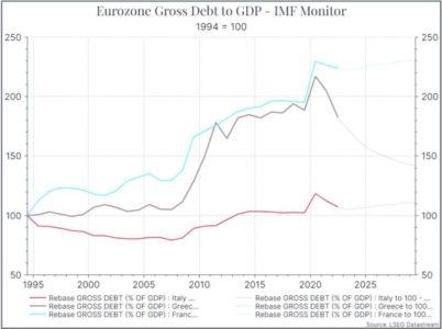 Se si confronta il rapporto debito/PIL di Italia, Grecia e Francia, quest’ultima ad oggi si trova sicuramente in vantaggio, ma se si osserva l’evoluzione del parametro nel tempo, il quadro cambia: negli ultimi venticinque anni, il rapporto debito/PIL in Italia è rimasto abbastanza stabile, mentre in Francia è aumentato in modo più significativo e, secondo le stime del Fondo Monetario Internazionale, è destinato a salire ancora, laddove il debito/PIL greco, ad esempio, dovrebbe diminuire in modo piuttosto netto.