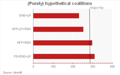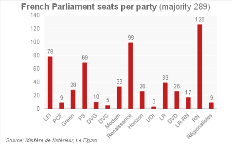 Detto questo, qualsiasi coalizione possa emergere si rivelerà probabilmente molto fragile. Inoltre, NFP e RN, che hanno entrambi chiesto la cancellazione della riforma pensionistica, sono nella posizione di realizzarla, se dovessero osare a farla; questo sarebbe un pessimo segnale per i mercati. I risultati elettorali riflettono alleanze piuttosto insolite, 1/ all’interno del blocco di sinistra NFP – date le grandi differenze di opinioni politiche – e 2/ in vista del secondo turno. Questo renderà più difficile la formazione di una coalizione. Anche all’interno di Ensemble, la destra (Horizon) potrebbe rifiutare gli aumenti delle tasse che inevitabilmente emergerebbero da una coalizione di centrosinistra. Anche gli alleati di E. Macron (ad esempio G. Attal ed E. Philippe, che guardano con interesse alle elezioni presidenziali del 2027) hanno iniziato a prendere le distanze dal Presidente. Per questo motivo, il moderato sollievo manifestato al secondo turno (quando è diventato chiaro che il RN non avrebbe raggiunto la maggioranza) potrebbe non avere alcun seguito. L’estrema sinistra e l’estrema destra sono state arginate, ma i risultati elettorali non sono a favore della stabilità politica né un promettente programma di riforme