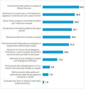 Secondo i risultati del panel AIBE, il prossimo mandato di legislatura dell’Unione europea dovrebbe necessariamente perseguire la politica di difesa comune (43,9%), un piano efficace per un’immigrazione regolata e condivisa da tutti i Paesi membri (38,6%), l’attuazione del Green Deal Europeo e il raggiungimento della neutralità climatica per l’industria europea (36,8%). Un consenso piuttosto ampio è poi attribuito alla necessità di procedere alla condivisione del debito pubblico fra tutti i Paesi dell’Unione (35,1%) e, nello stesso tempo, affrontare le sfide della doppia transizione e delle spese militari attraverso l’emissione di eurobond (53,6%).