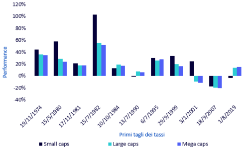 In nove degli ultimi 11 cicli di riduzione dei tassi (a partire dal 1974), le azioni hanno registrato rialzi nei 12 mesi successivi al primo taglio.