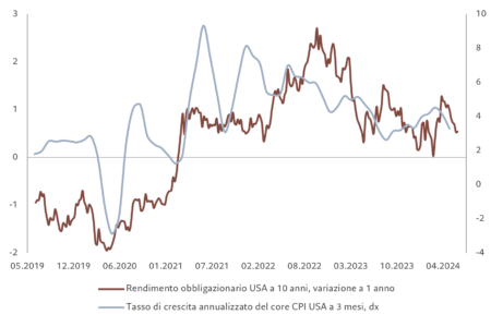 Rendimento dei titoli di Stato statunitensi a 10 anni rispetto al momentum dell’indice core CPI