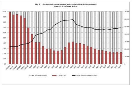 Dall’esame delle tipologie di ricavo, si rileva che, nel 2023, i dividendi sono pari a 1.522,3 milioni di euro (+22,5% rispetto al 2022): di cui 944,7 milioni da partecipazioni bancarie (47% sul totale dei proventi) e 577,6 milioni da partecipazioni non bancarie (28,7% sul totale dei proventi). Seguono: gestione degli strumenti finanziari (305,3 milioni, 15,2%) gestioni patrimoniali (104,5 milioni di euro, 5,2%), altri proventi ordinari di natura non finanziaria e straordinari (78,2 milioni, 3,9%).
