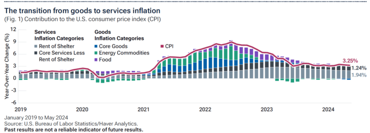 Quest’anno la direzione dell’inflazione non è stata chiara. Mentre i dati di gennaio e marzo hanno implicato sgradite sorprese al rialzo, i risultati di aprile e maggio sono stati più favorevoli. Ciò ha portato molti investitori a chiedersi quale sarà il futuro della politica della Fed e dei tassi d’interesse. L’impennata iniziale dell’inflazione, a seguito della pandemia di Covid, è stata in gran parte guidata dai prezzi dei beni. Nel 2023, questa dinamica si è modificata e l’inflazione dei beni ha subito un brusco rallentamento. L’inflazione dei servizi, invece, è rimasta ostinatamente alta e attualmente sta guidando quasi tutto l’aumento dell’indice dei prezzi al consumo degli Stati Uniti.