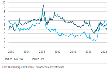 Un indicatore utile dell’equilibrio tra domanda e offerta è l’emissione netta di obbligazioni IG nel mercato primario (come misura dell’offerta) al netto degli afflussi di fondi in fondi comuni ed ETF IG (come misura della domanda). Se si combinano i flussi europei dell’IG e dell’Hight Yield (HY), sulla base di una media mobile a 60 giorni nel corso di 10 anni, la situazione appare positiva in termini storici, anche se è leggermente peggiorata negli ultimi tempi. L’indicatore forse più importante per valutare il quadro tecnico è il rendimento offerto dal credito IG rispetto alle azioni. Da questo punto di vista ci troviamo nelle condizioni migliori degli ultimi 20 anni. I rendimenti del credito globale si aggirano intorno al 5% rispetto all’earnings yield dell’S&P 500, che si attesta oggi intorno al 4%.